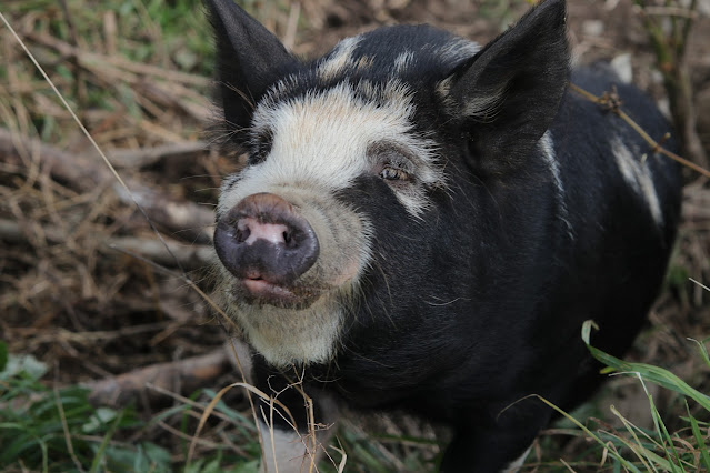 Our pigs, Faithful and Shenanigans are getting nice and plump.  Have I ever told you the story of their names?  Faithful is a sweet and friendly pig, my favorite we've ever had.  She is a real sweetheart and comes right up to you for an ear scratch or rub on the back.  Shenanigans, on the other hand, is a real stinker.